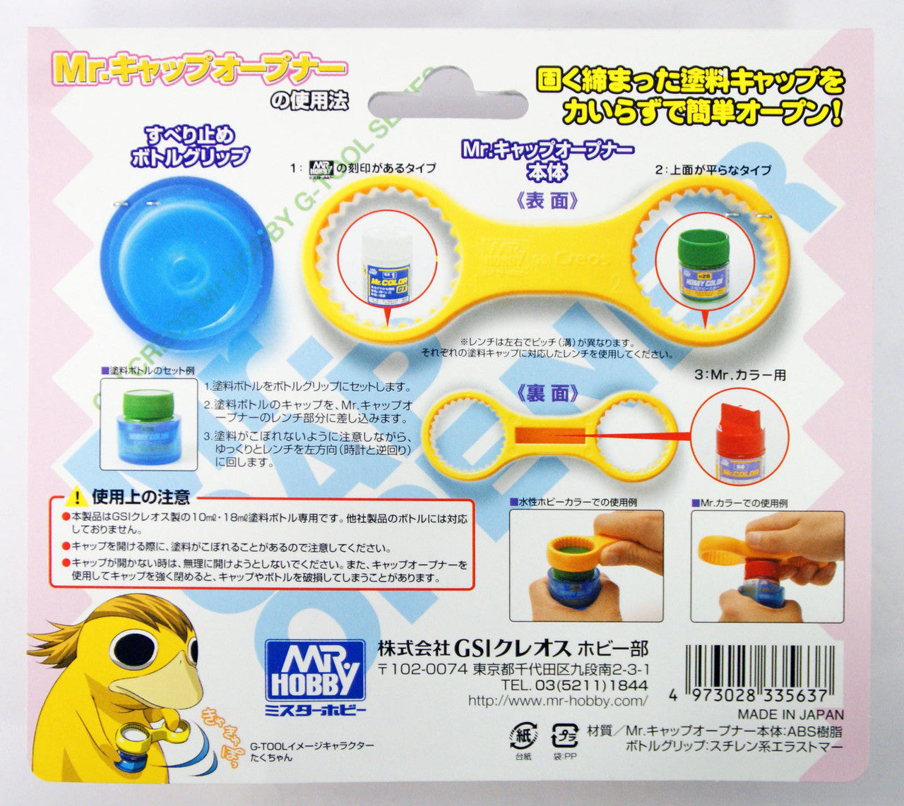 Specialized opener designed for GSI Creos paint bottles, featuring multiple socket sizes to fit different cap types and a non-slip grip for stable bottle control.